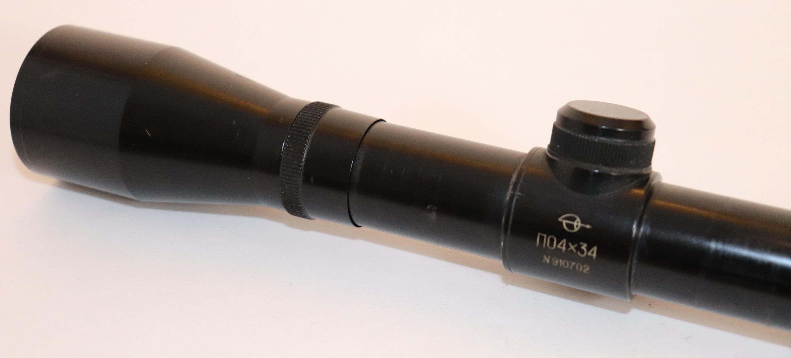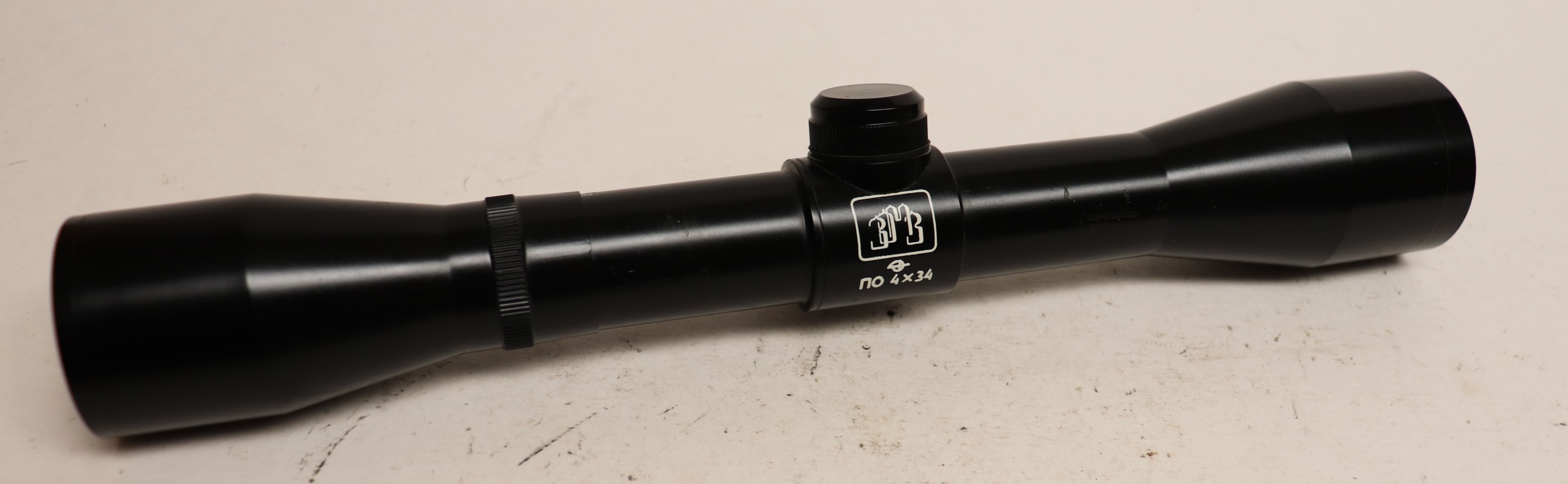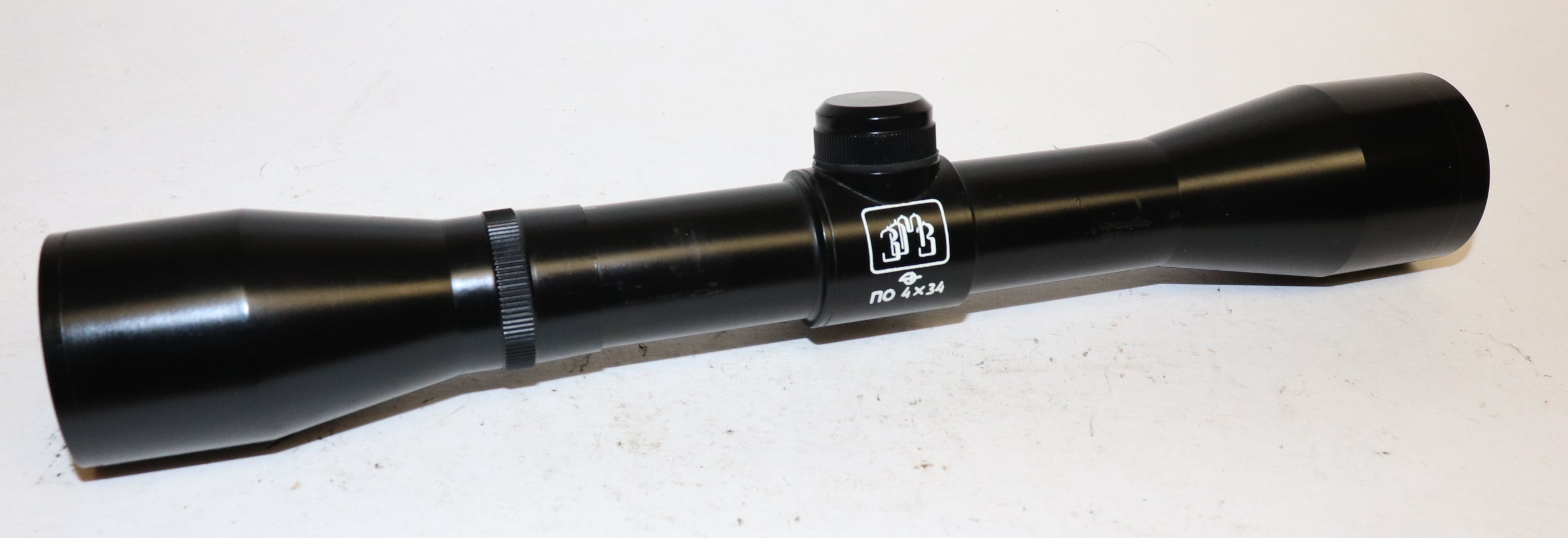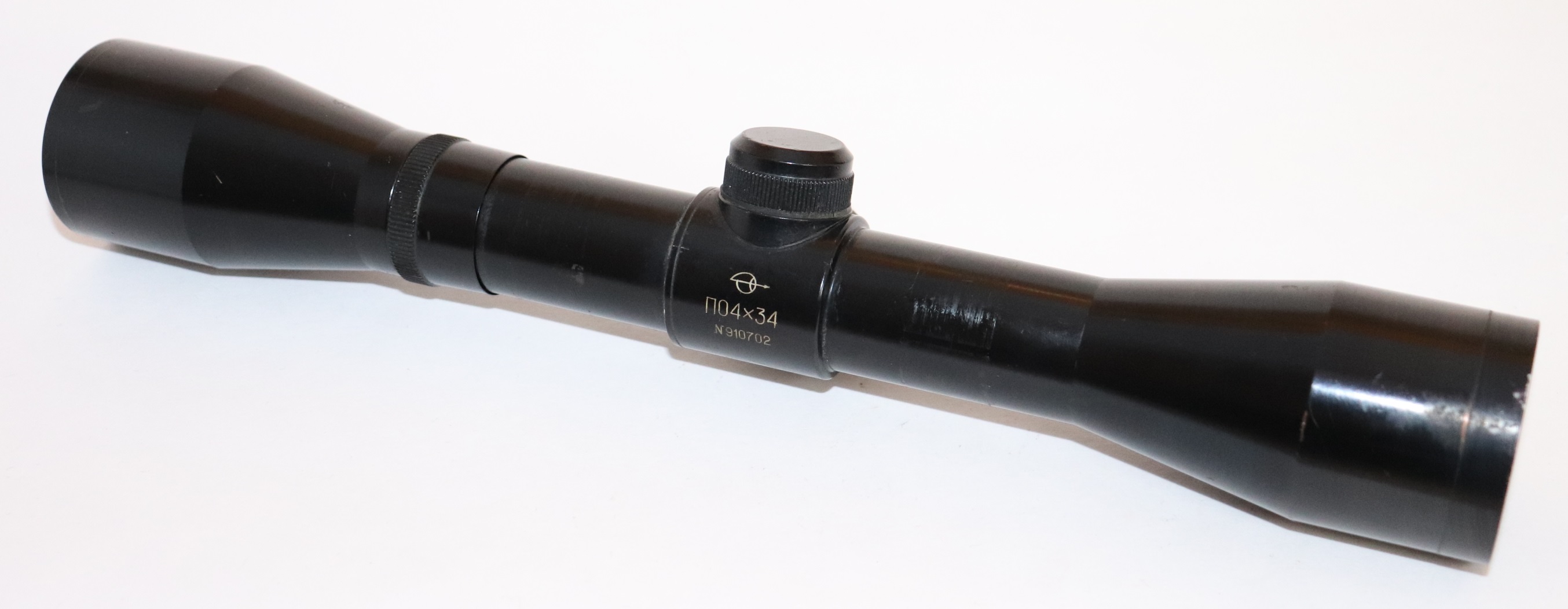 The PO 4x34 is a commerical 4x scope hunting scope produced by the Zagorsk Optical-Mechanical Plant (ZOMZ). A simple and functional scope it gained recognition in later years as the scope mounted on the Groza 9x39 bullpup. Production of the scope appears to have been spread out over nearly 25 years based on known serial numbers. Examples produced by the Arsenal Factory in Kiev Ukraine are also known to exist.