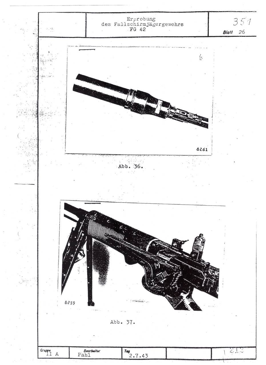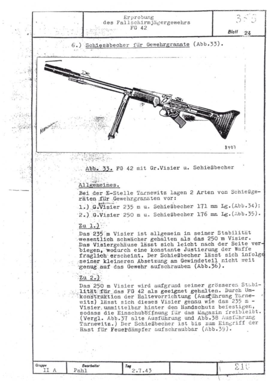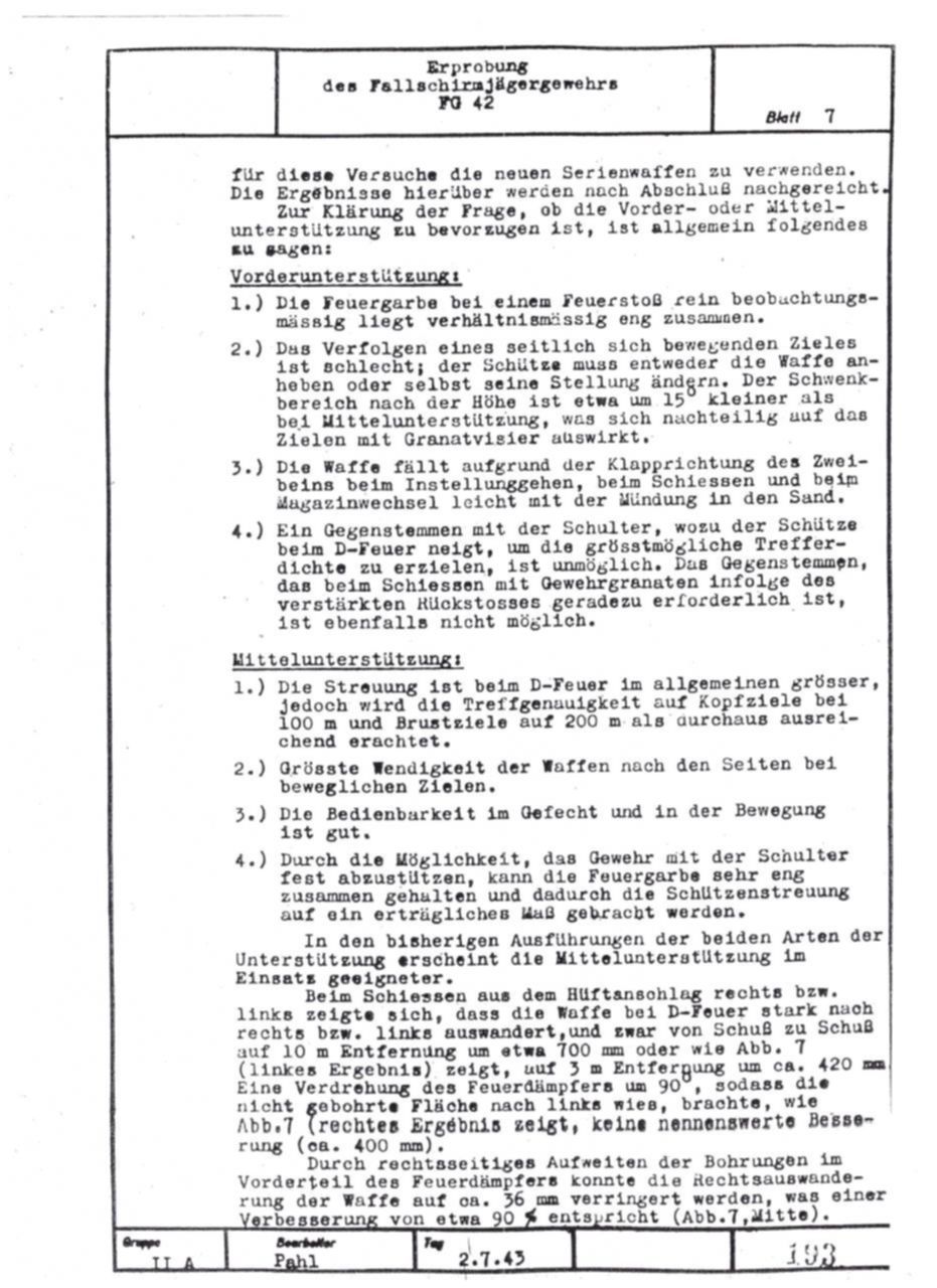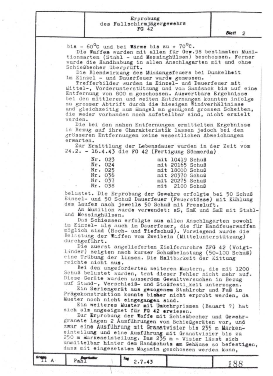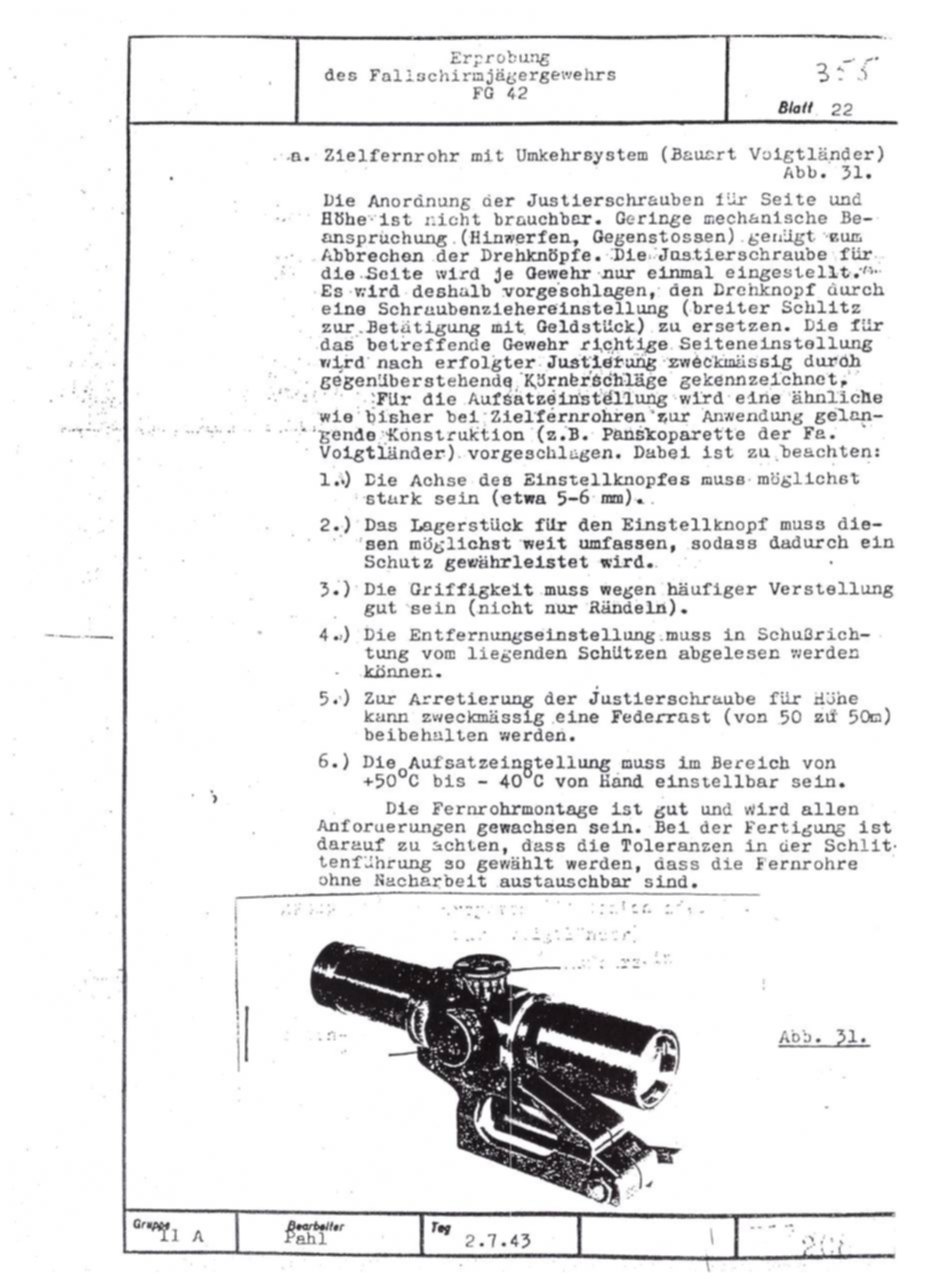 German FG42 testing report dated July 2, 1943. Includes results on both the ZFG42 and Voigtländer's prismatic FG42 sight.