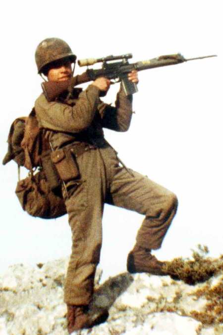 Italian soldier with scoped BM59. Probably a commercial M1 Garand scope mount. Scope unknown but probably commerical also. See more speculation