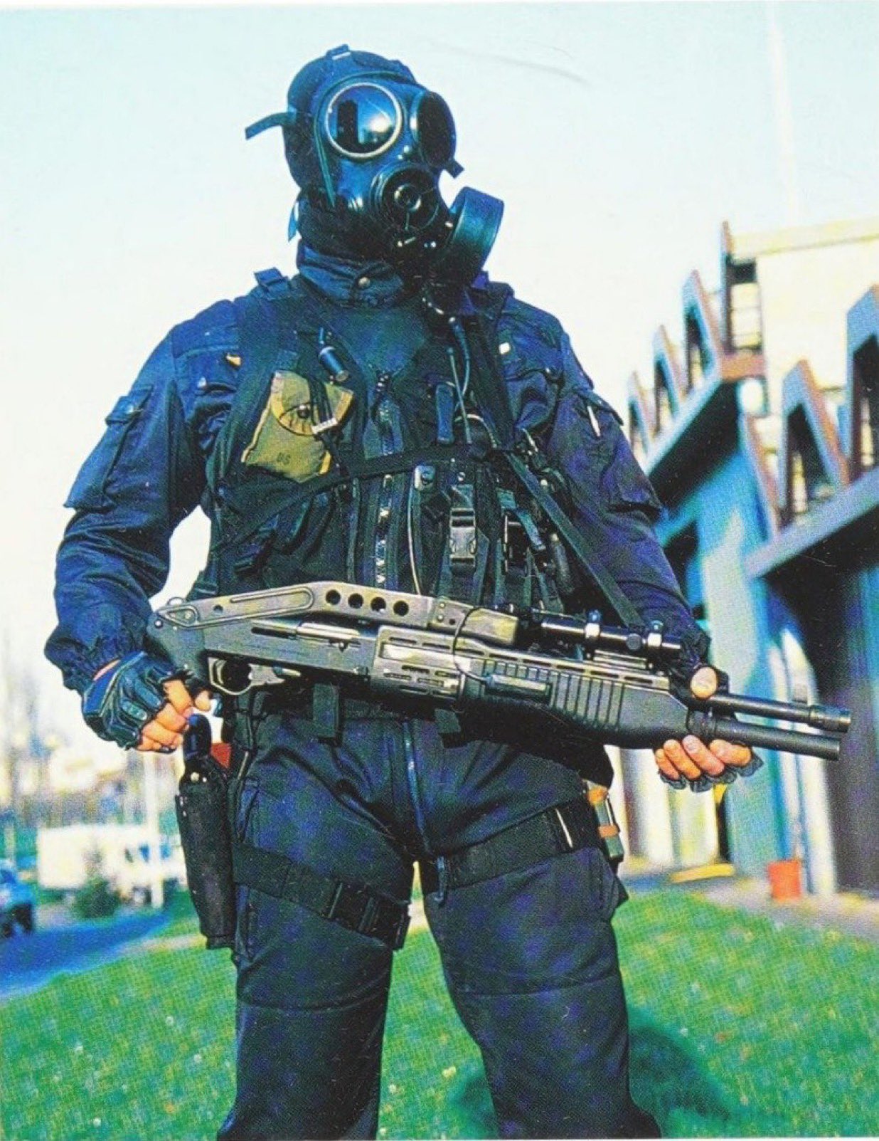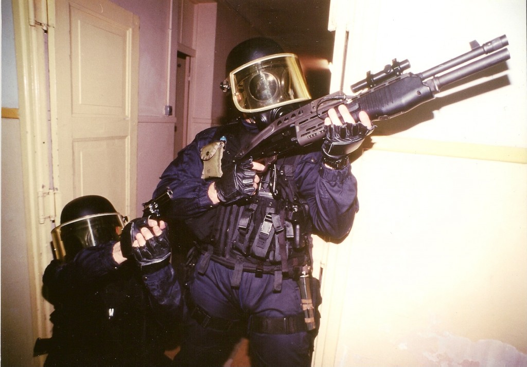 French GIGN with SPAS12, probably early 90s. Probably an early laser sight... Would make more sense when wearing a gasmask.