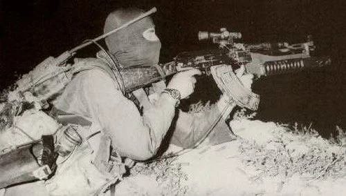 IDF soldier with captured Type 3 AK47. Has a Galil style M203 launcher attached. Photo probably dates from early 80s. Scope unknown.
