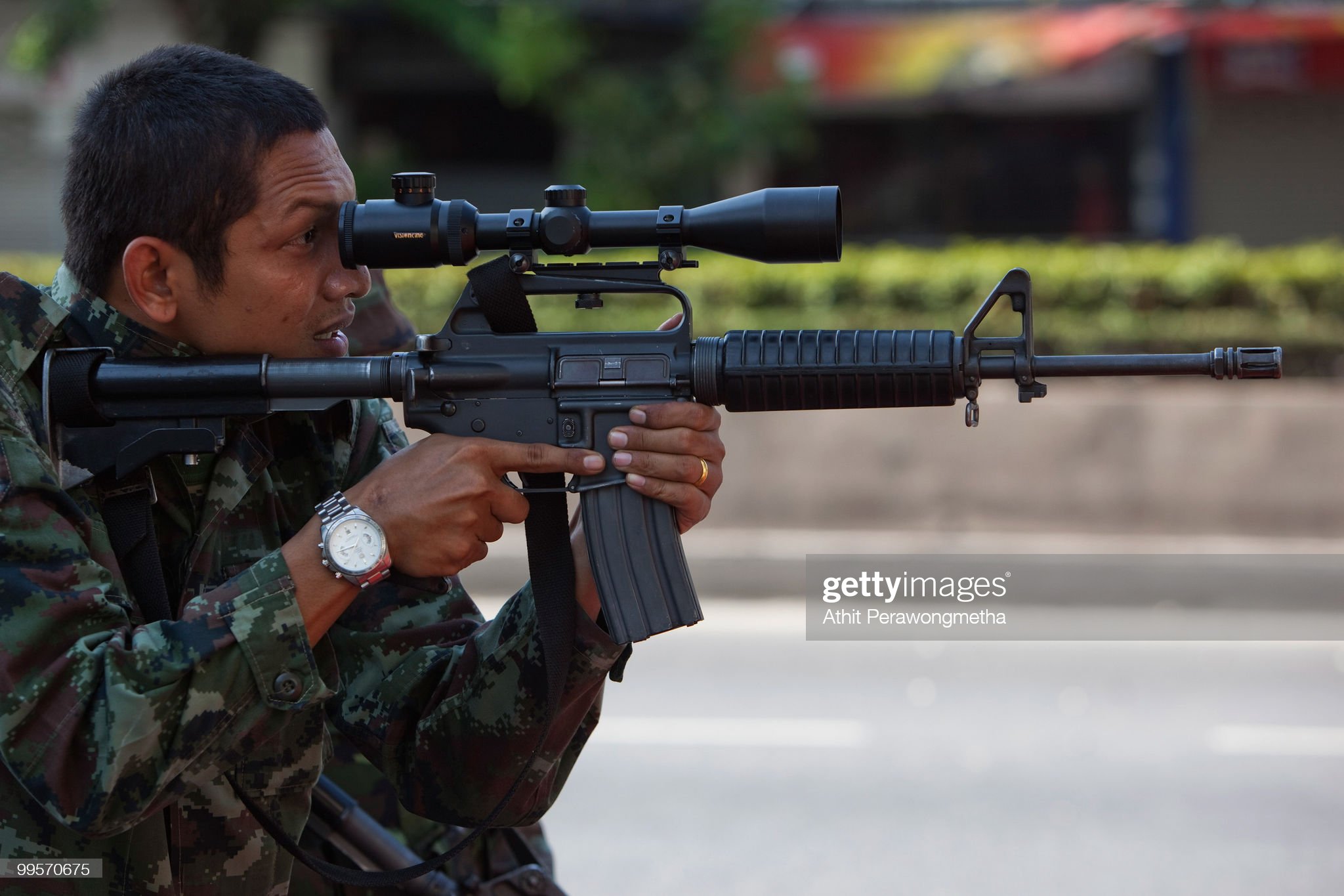 Carry handle M4 with rail and commerical scope with Thai security forces May 15, 2010. GettyImagesGettyImages