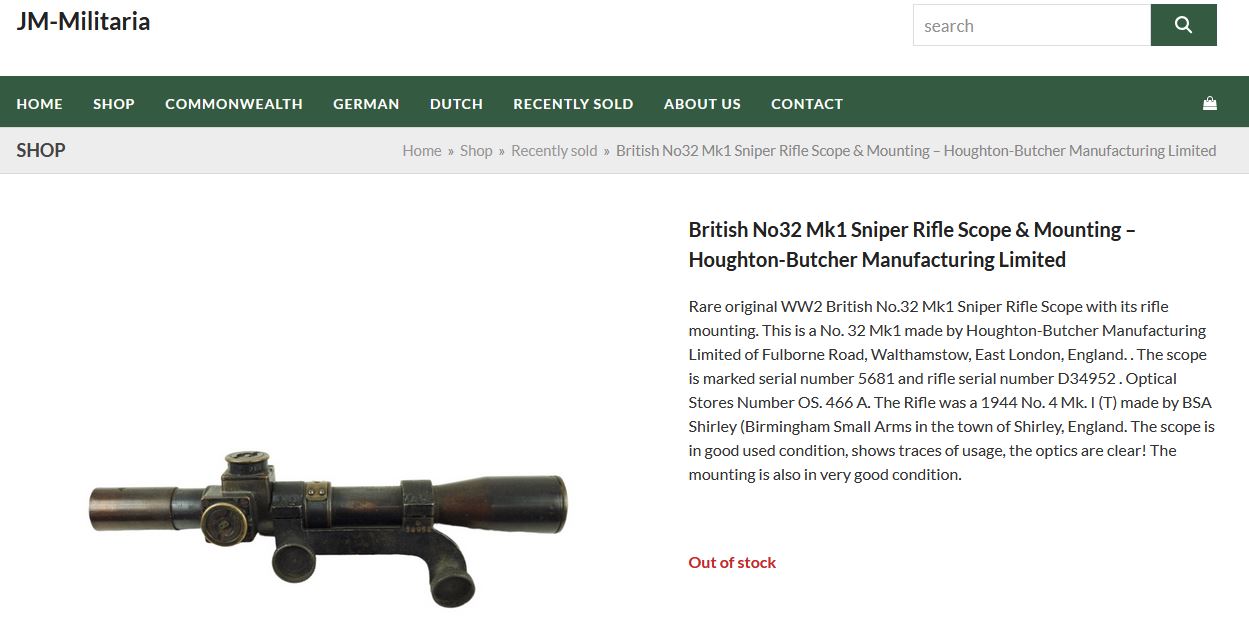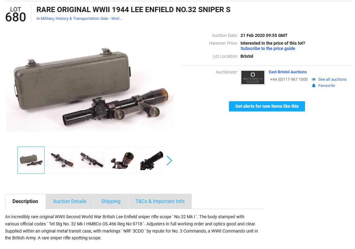 Between September 1940 and March 1941 minor refinements would be made to the scope and mount design and the scope would be given the name No.32 Mk I (Payne & Tomkinson, 1999). From May 1940 till September 1942 Enfield would produce 1,403 rifles using the No.32 scope. Starting in September 1942 London based Holland & Holland would take over the process of converting No.4 rifles into No.4 (T) sniper rifles, in total 26,442 such rifles would be converted (Peger, 2010 ).