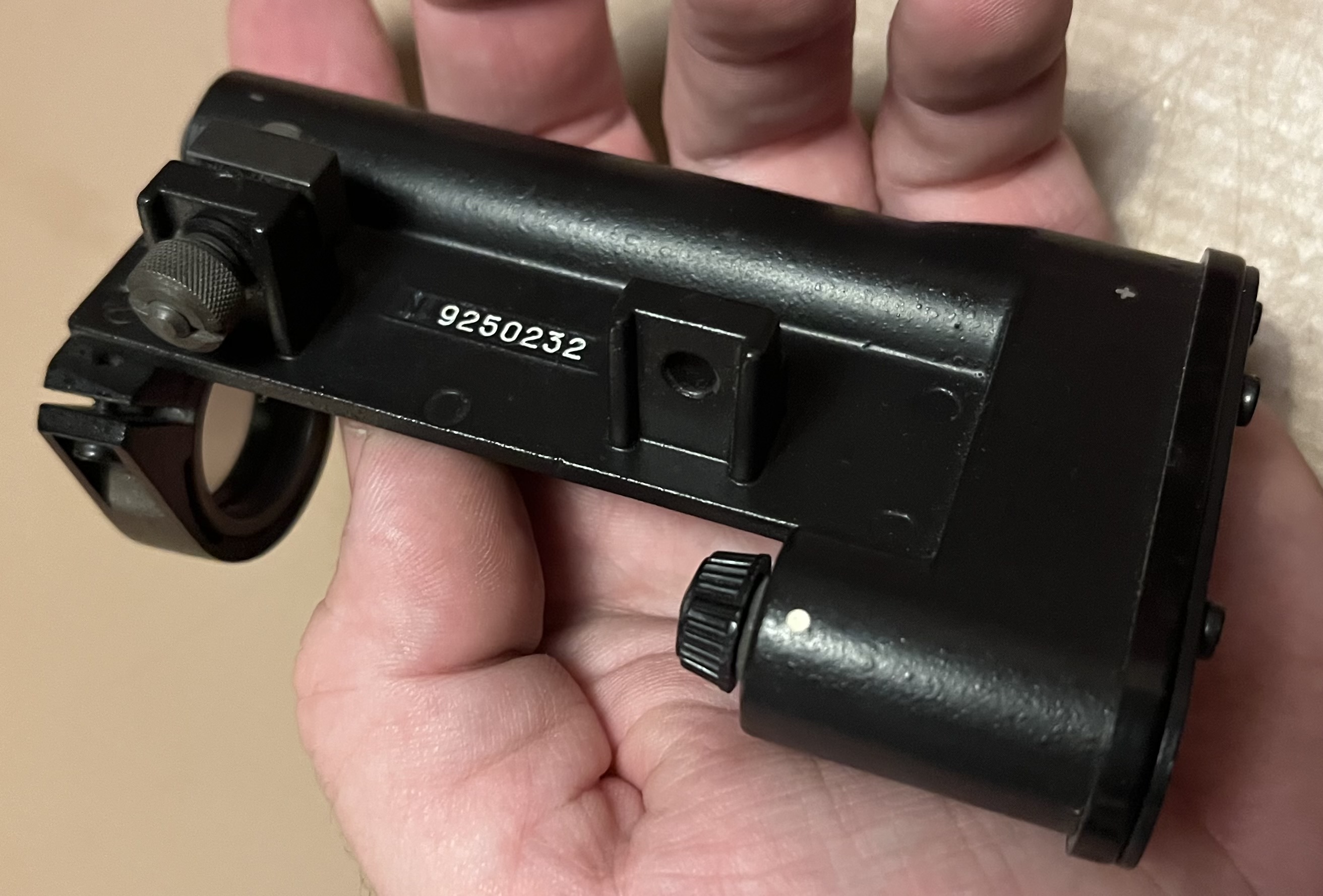 The Rusak is a simple red dot that was produced in Russia by the Kazan Optical-Mechanical Plant (KOMZ) during the early 90s. Not much information can be found regarding it. It can be found in both a domestic Russian version (РУСАК) and in an export model (Rusak) which are identical in all but name. While it is possible production started in the late 80s, all known sights have Russian style commerical serial numbers with a production year prefix in the 1991 to 1994 range bracket. Examples of the sights with no serial number have been found. While the sight is similar in layout to the Kobra, another Russian commerical red dot, the author has no evidence of the Rusak being used by militaries. The sight is sometimes referenced to as the PRU 452 on the internet. It is unclear where this name originates from. The sight is powered by two AA batteries.
