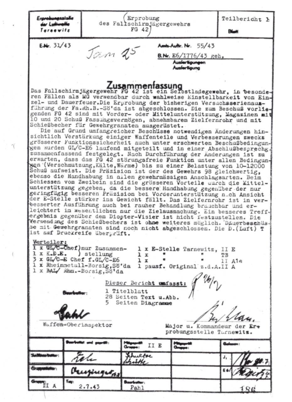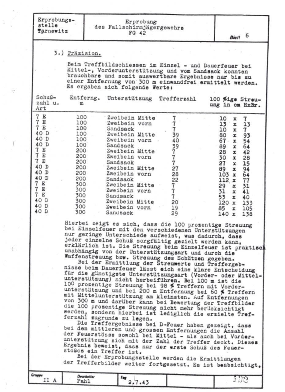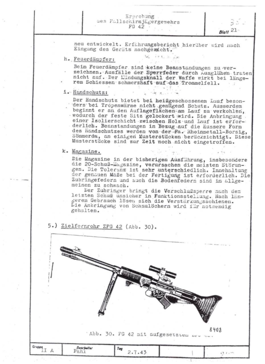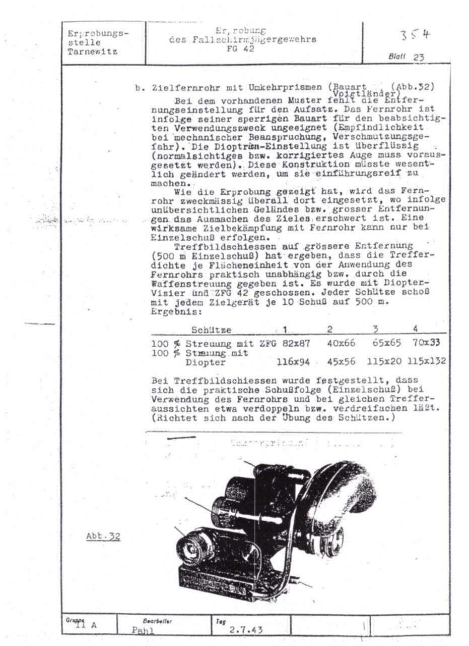 German FG42 testing report dated July 2, 1943. Includes results on both the ZFG42 and Voigtländer's prismatic FG42 sight.