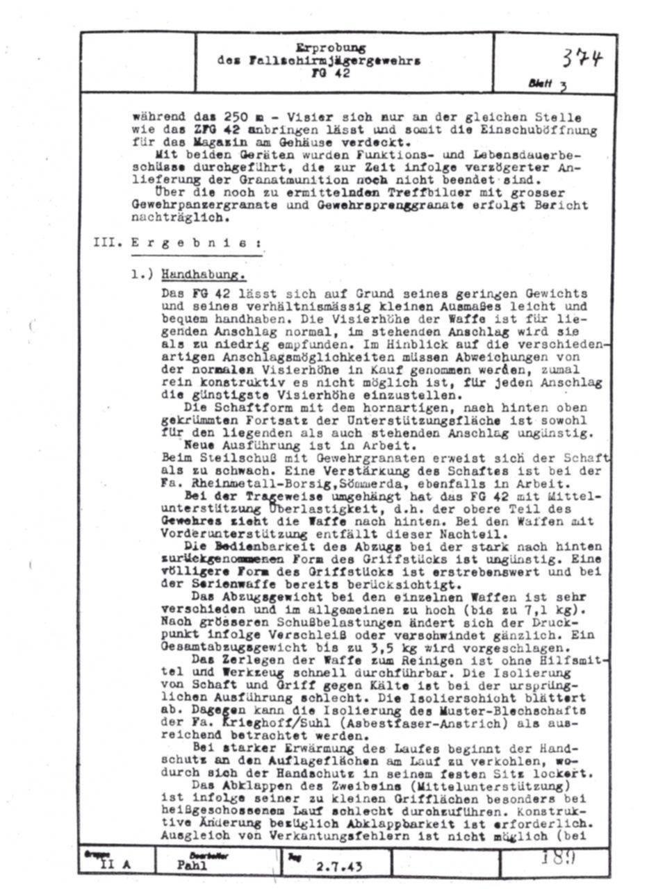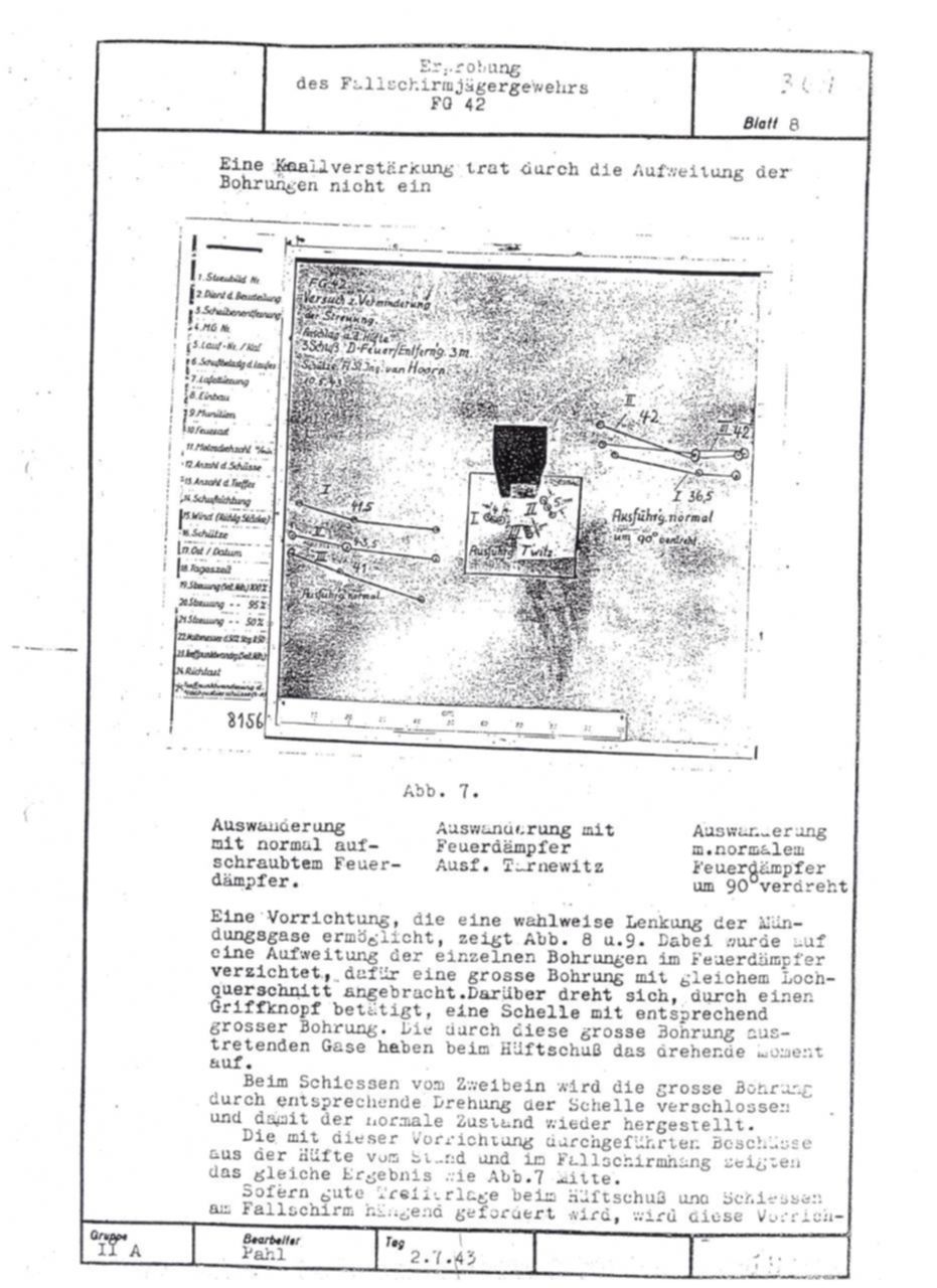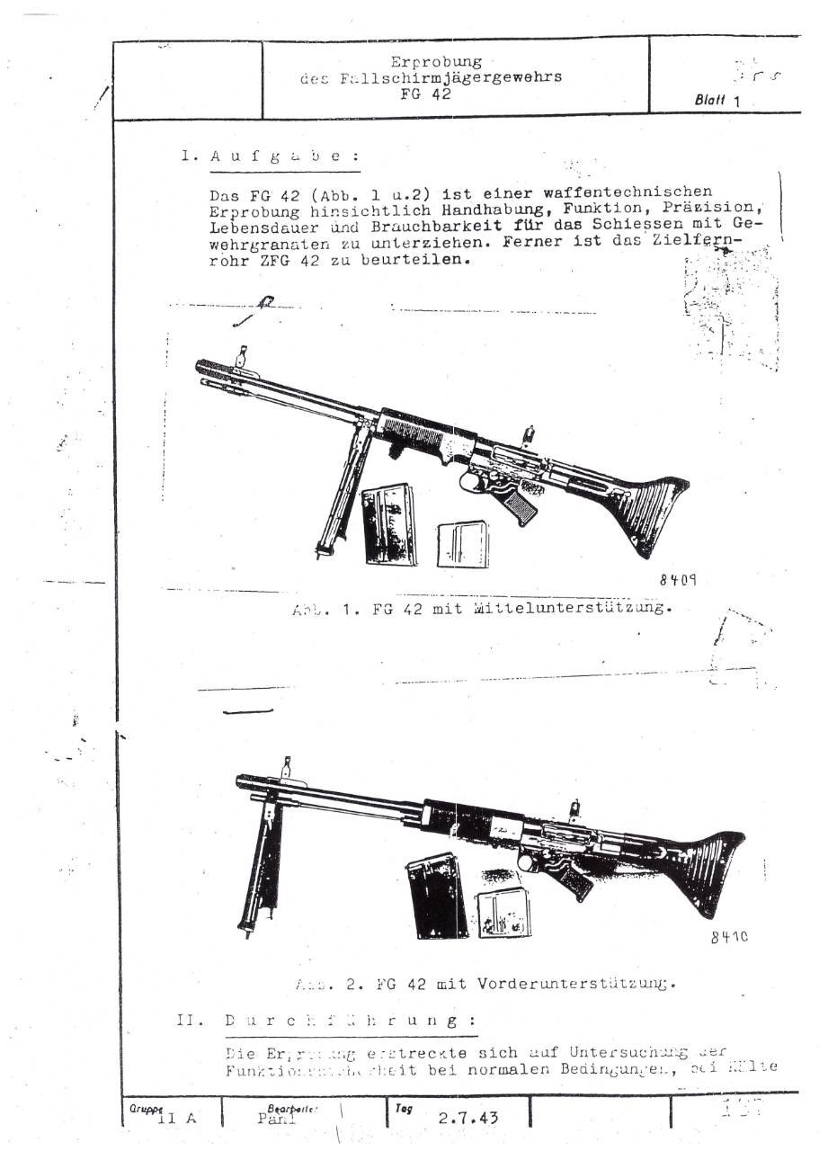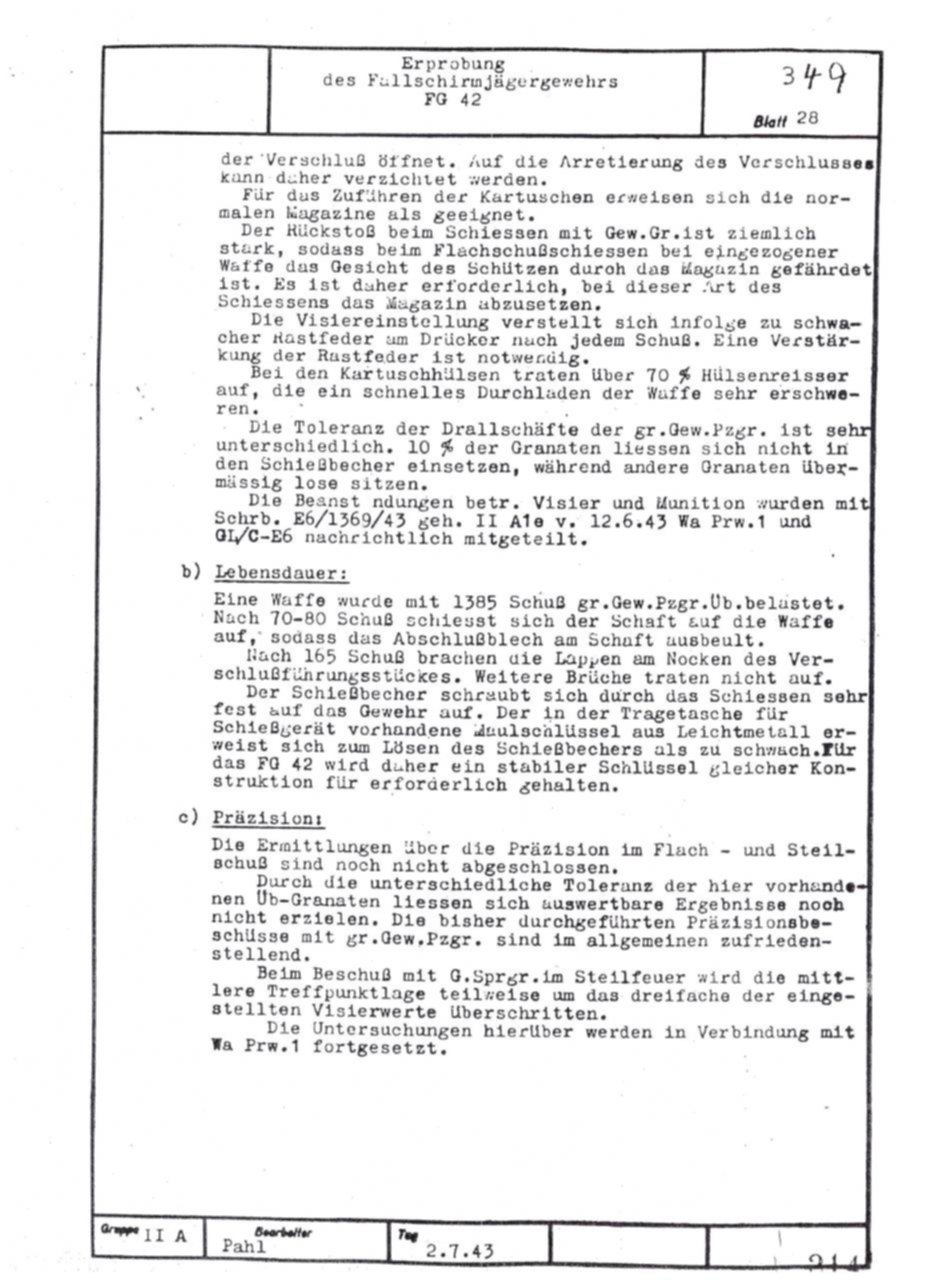 German FG42 testing report dated July 2, 1943. Includes results on both the ZFG42 and Voigtländer's prismatic FG42 sight.