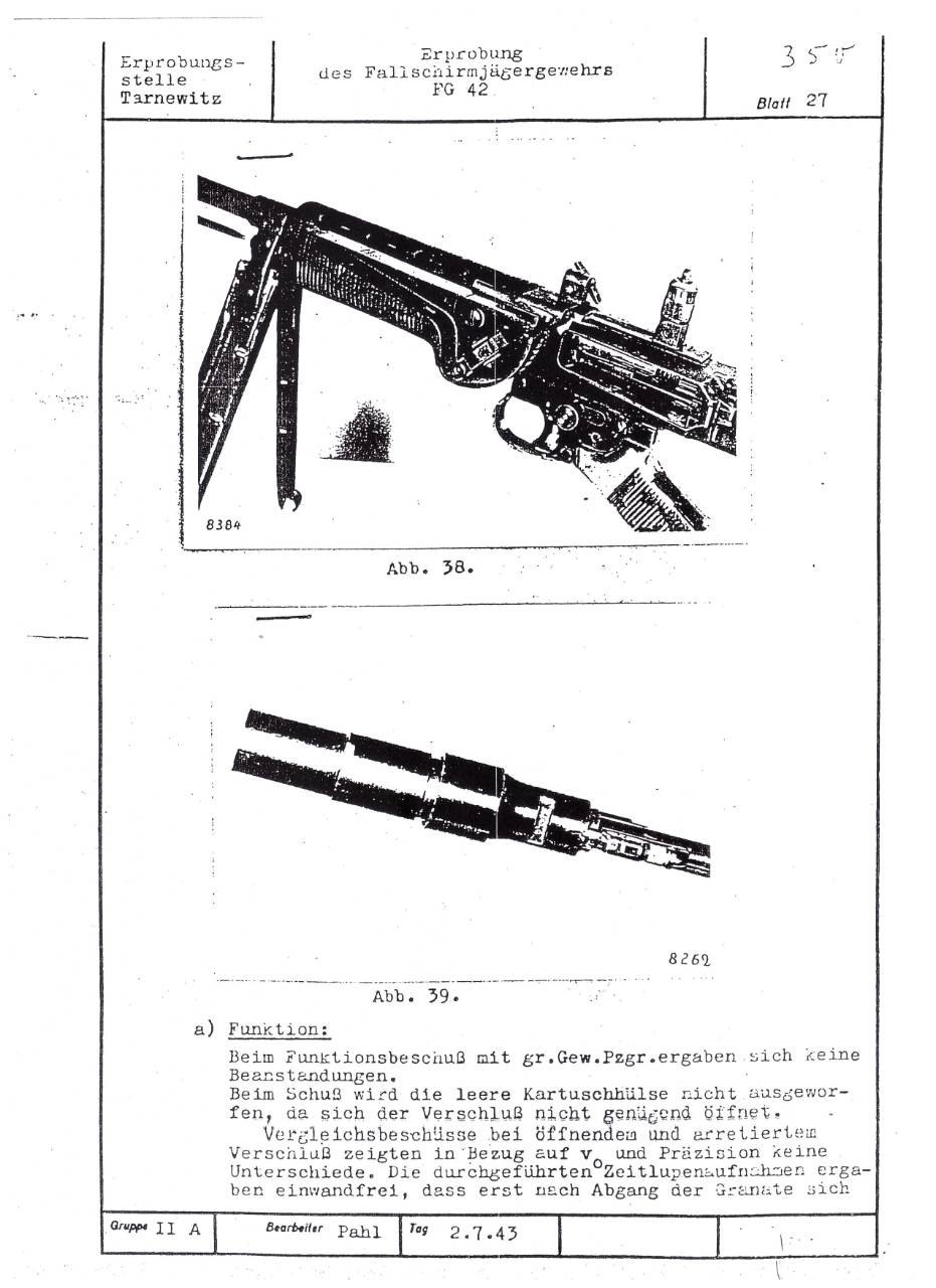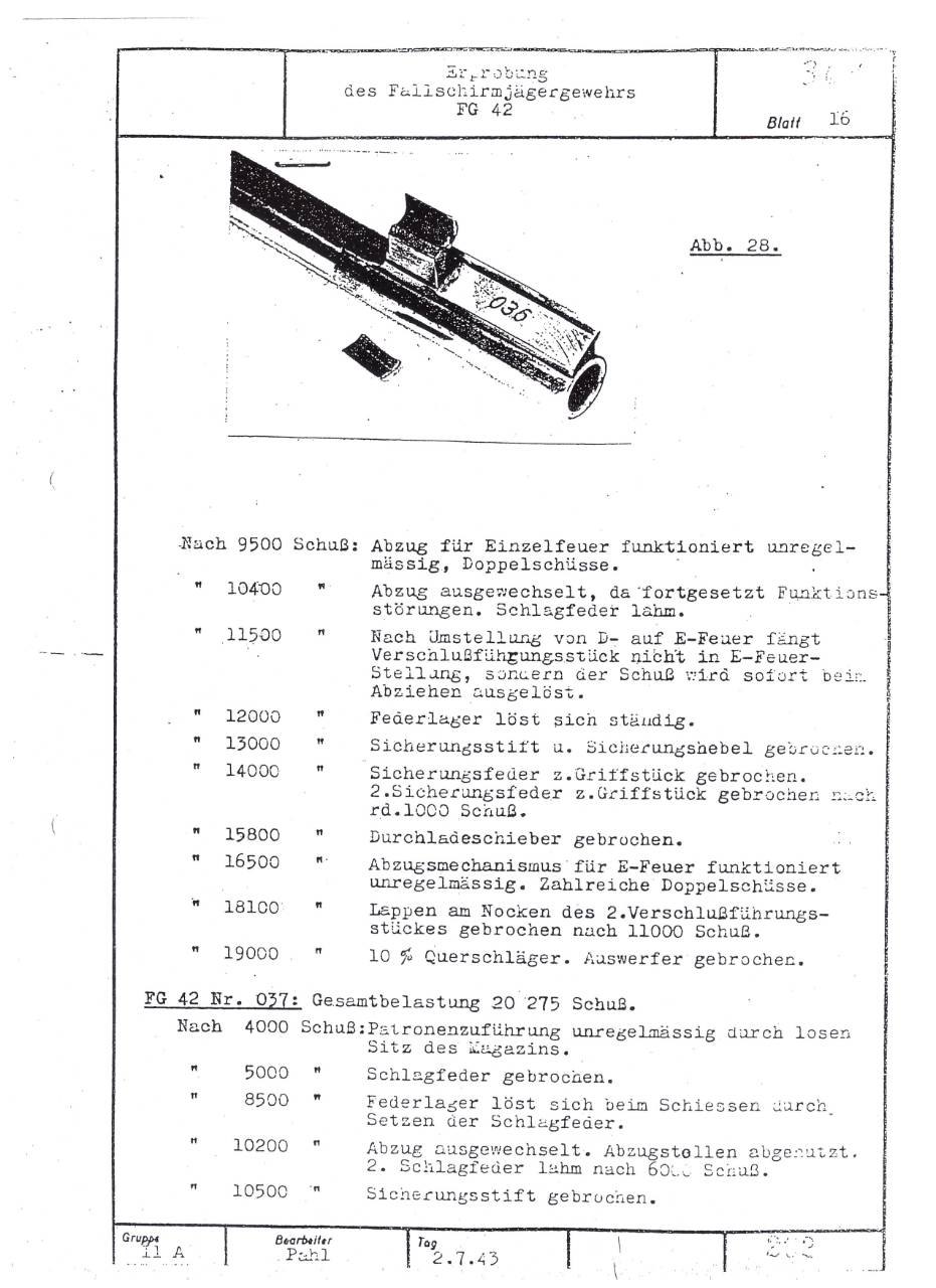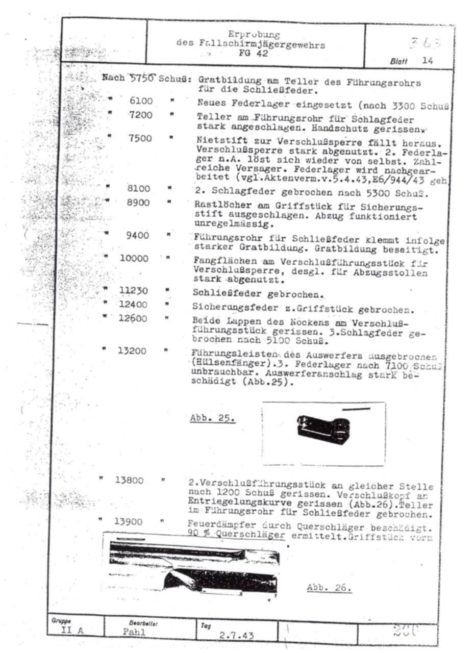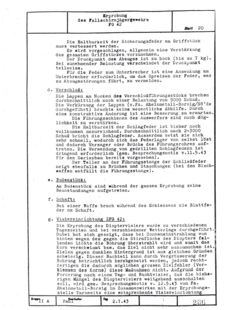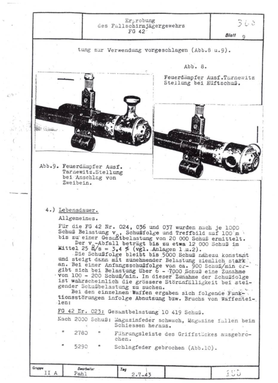 German FG42 testing report dated July 2, 1943. Includes results on both the ZFG42 and Voigtländer's prismatic FG42 sight.